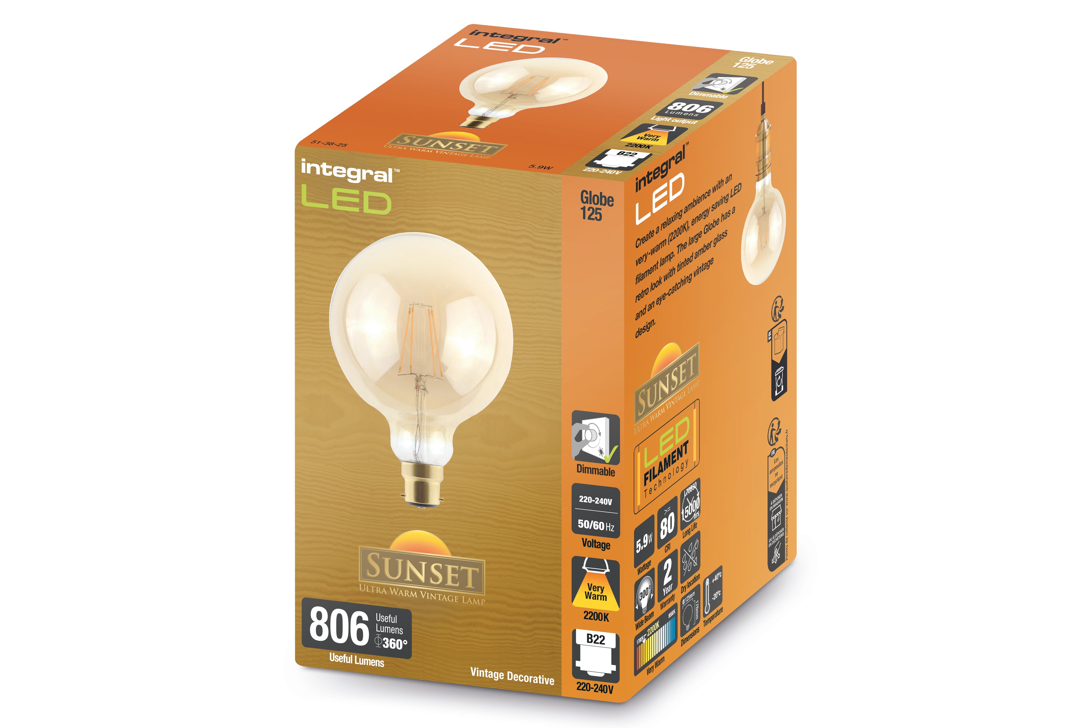 SUNSET VINTAGE FILAMENT GLOBE G125 BULB E27 806LM 5.9W 2200K DIMMABLE 300 BEAM AMBER