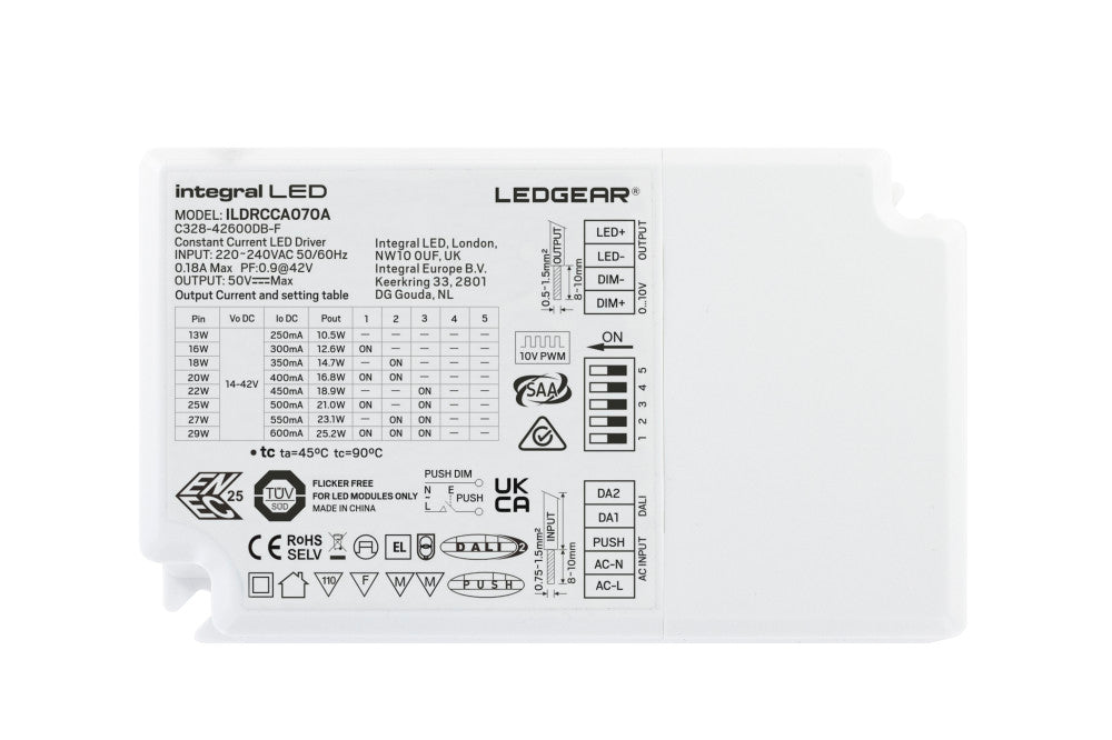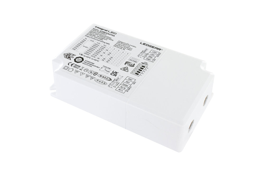 The 40W constant-current LED driver operates in the 200-240VAC input range. It features an adjustable output current and is DALI, DALI2, and P dimmable.